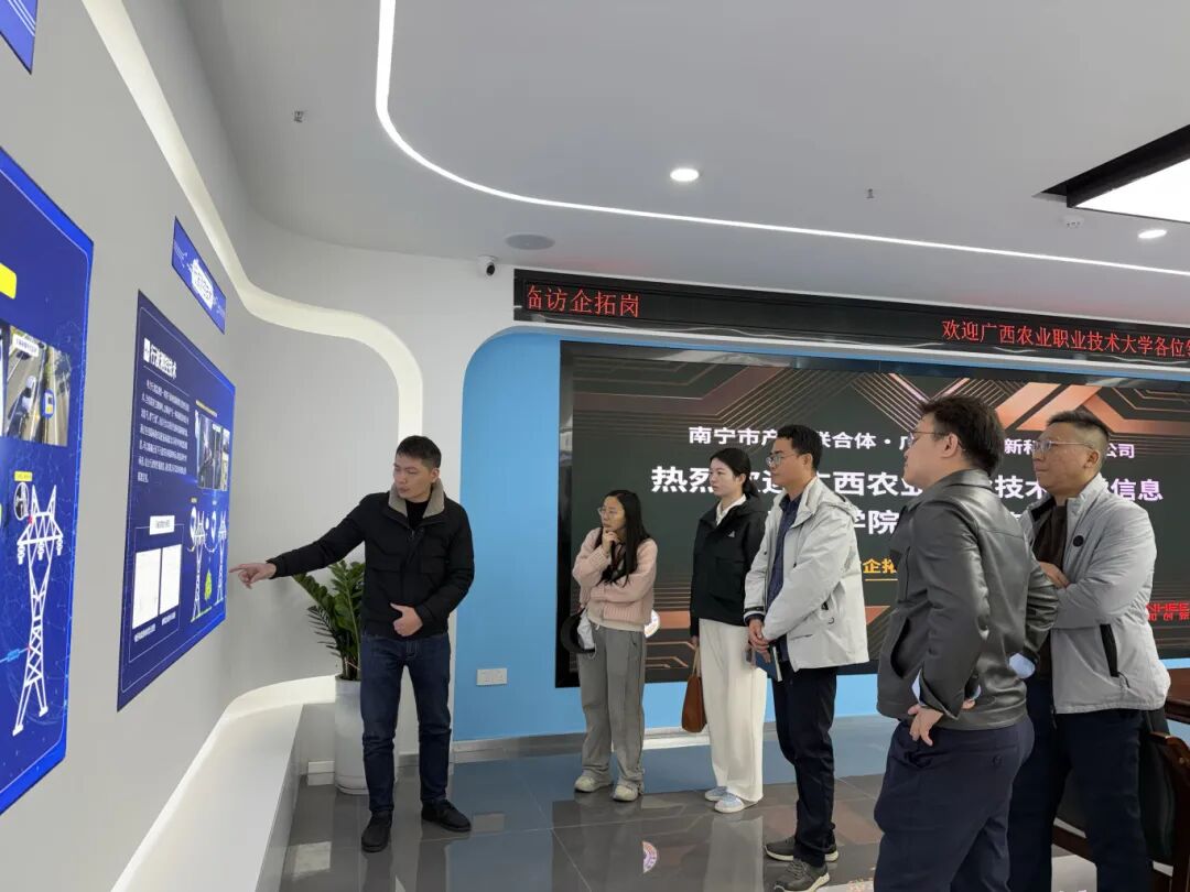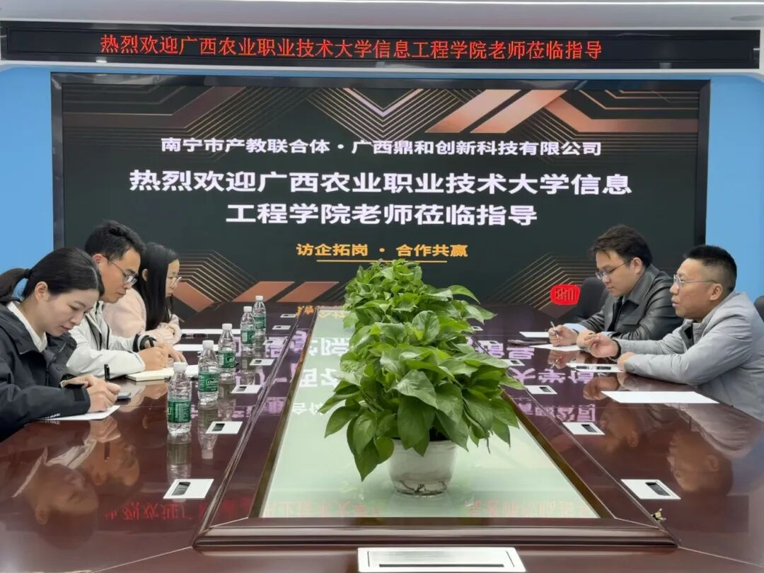 2026 年 1 月 26日,依托南宁市电子信息产教联合体搭建的产教融合桥梁,广西农业职业技术大学信息工程学院组团赴广西鼎和创新科技有限公司(下文简称“鼎和创新”)开展访企拓岗专项活动,通过实地调研、深度洽谈,精准对接企业用人需求,明确人才培养优化方向,双方初步达成多项合作共识,彰显了产教联合体在链接校企资源、赋能产业发展中的核心纽带作用。
